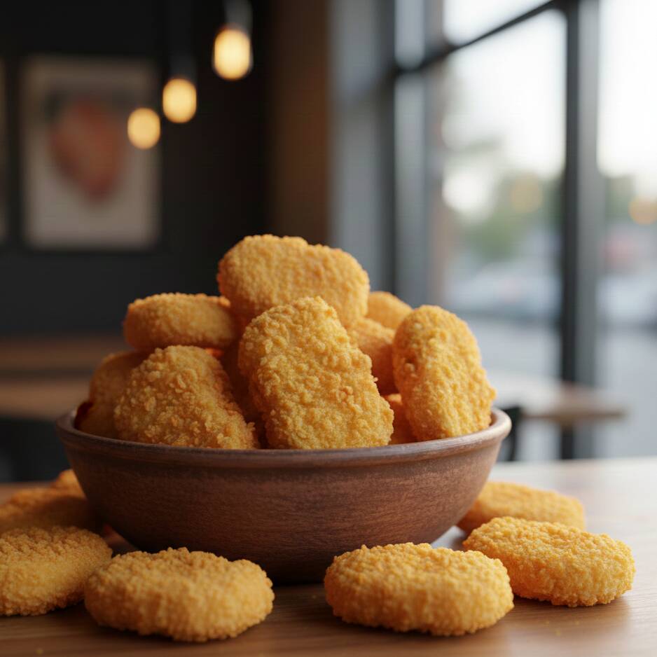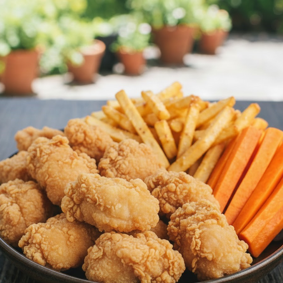 Nuggets de Pollo acompañados de papa francesa y bastones de zanahoria