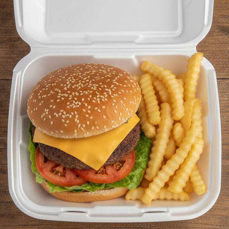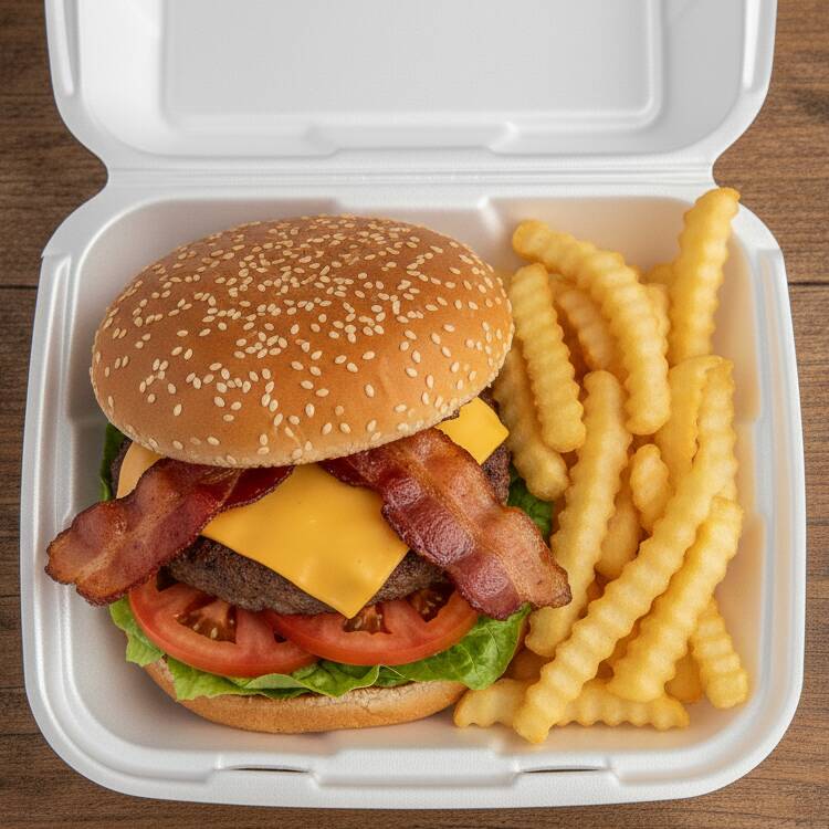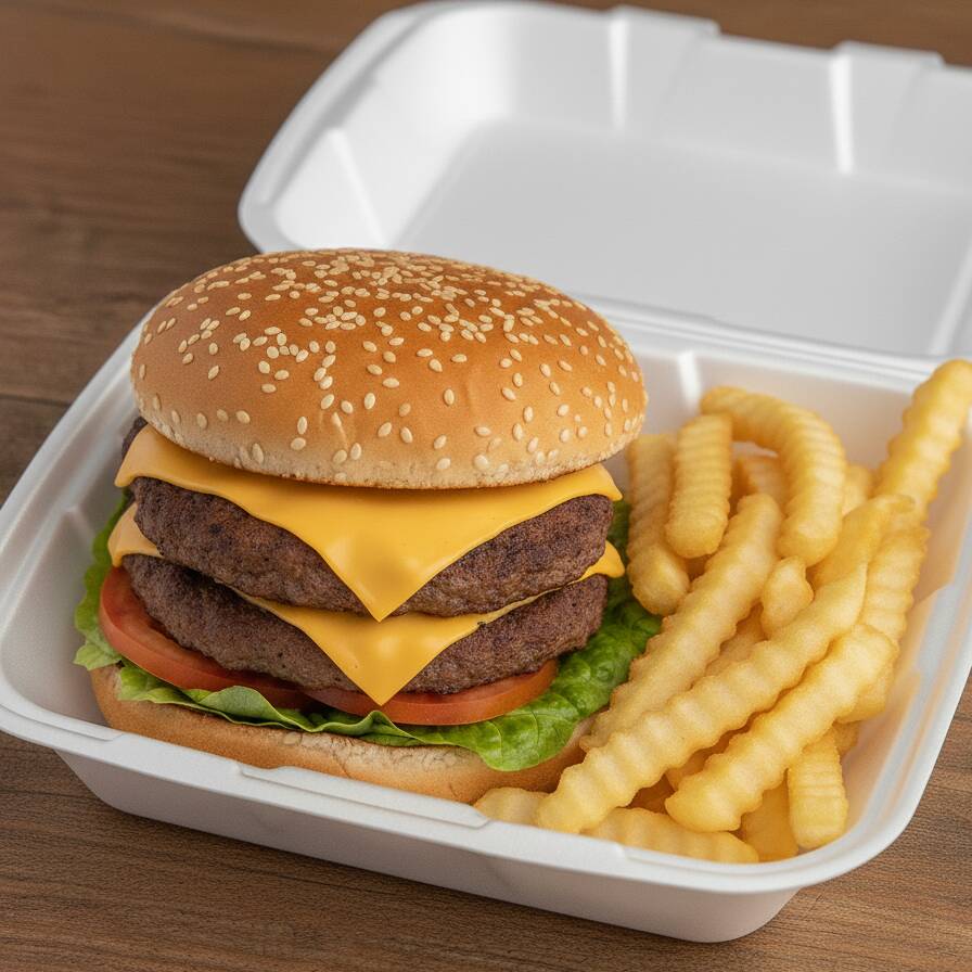 Doble carne de la mejor calidad con cebolla, queso, lechiga jitomate y su orden de papas ya sean gajo o francesa