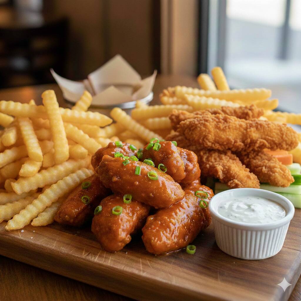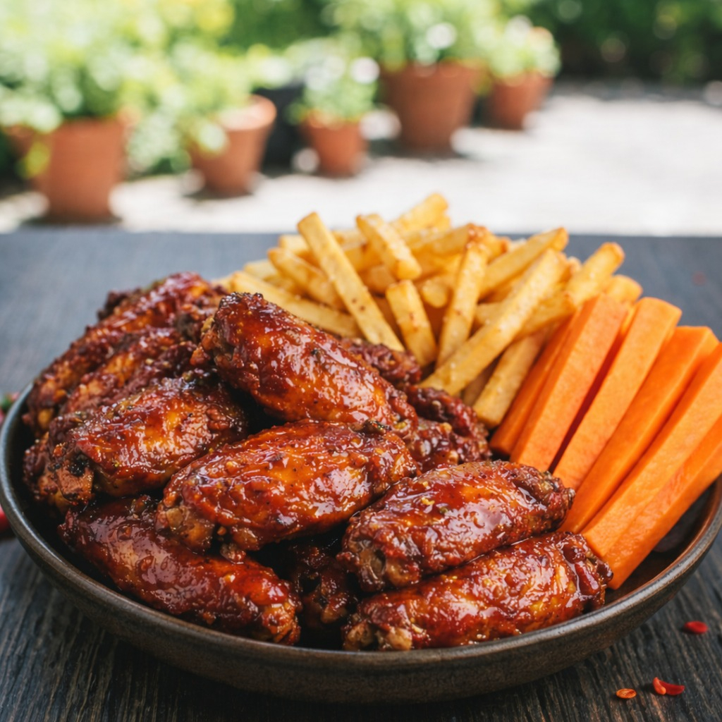Alitas fritas acompañadas de papa francesa y bastones de zanahoria