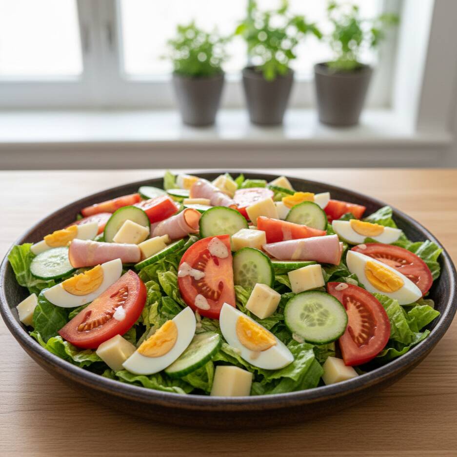 Lechuga, tomate, pepino, queso, huevo y jamon.