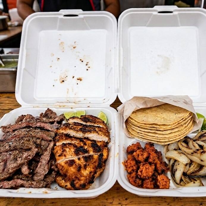 Bistec ,longaniza y pollo de proteínas. Acompañado de tortillas chiles cuaresmeño ,serrano ,cebolla y limon