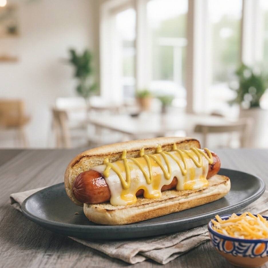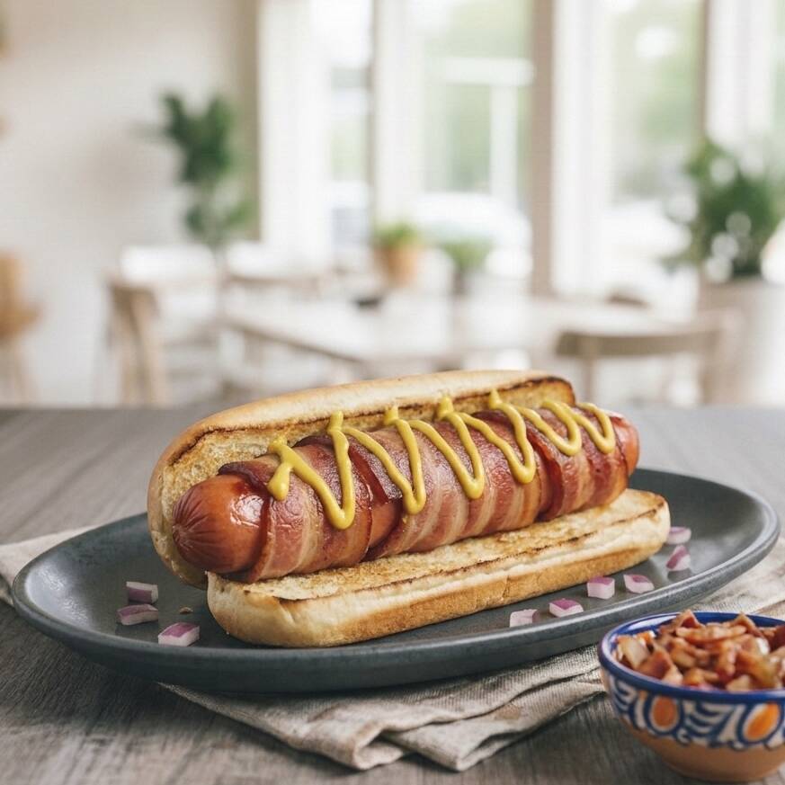 Hot Dog con queso gratinado coronado con rebanada de tocino frito y sus vegetales