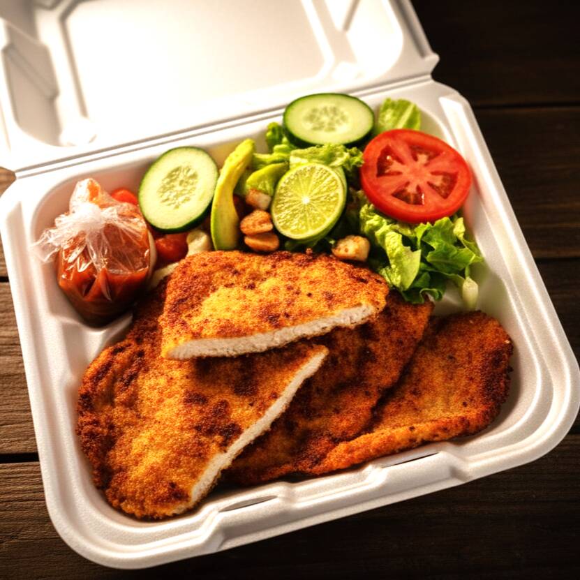 Pechuga empanizada de pollo acompañada de papas o ensalada.