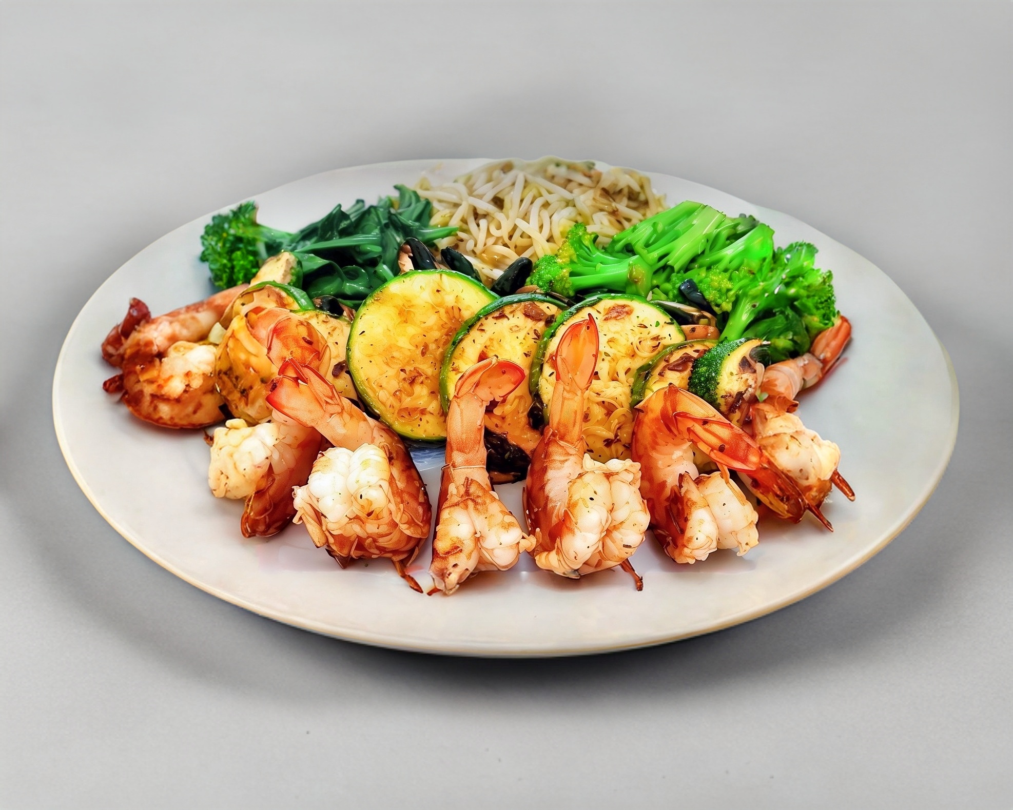 Pasta yakisoba, carne, camarón, verduras, salsa de manzana