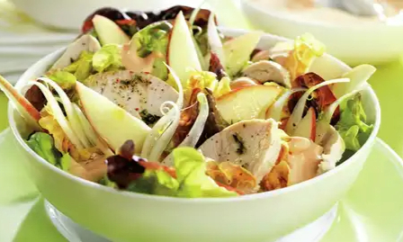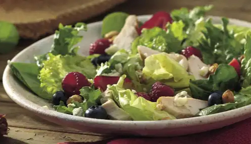 Ensalada de frutas con frutos rojos, lechuga romana, pechuga de pollo y mix de frutos en almíbar.