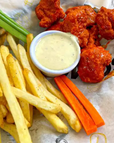 Boneless de pechuga de pollo cubiertos con salsa de su preferencia y porción individual de papas a la francesa.