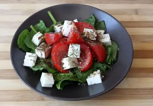 Ensalada vegetariana con espinaca, jitomate, queso panela y ajonjolí garapiñado.