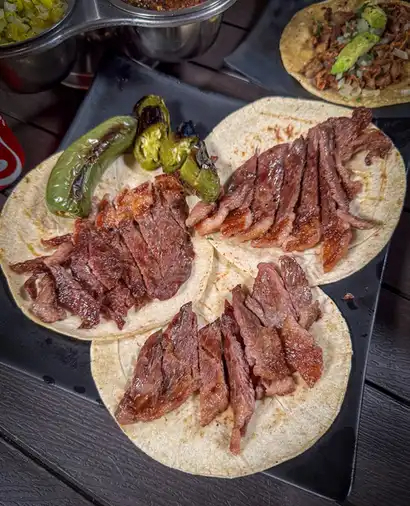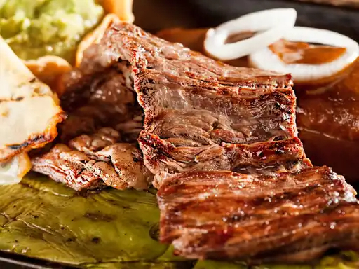 Arrachera de res sobre base a elegir, acompañada de tortillas y chiles asados.