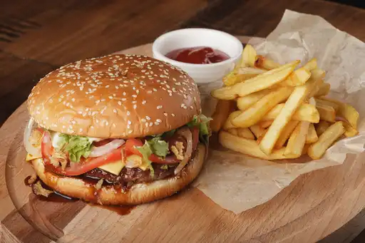 Hamburguesa preparada con doble carne de res, queso, lechuga, jitomate, cebolla, pepinillos, mayonesa y catsup, acompañada con papas a la francesa.