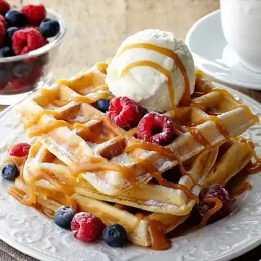 Waffles acompañados de pollo: Waffles servidos con pollo frito, arándanos y jarabe.