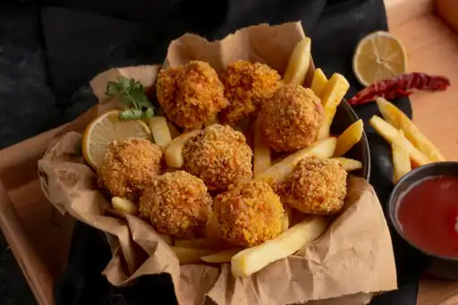 Palomitas de pollo, acompañadas de papas a la francesa.