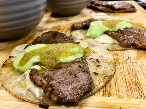 Taco de asada con tortilla de maíz, carne asada, cebolla y cilantro.