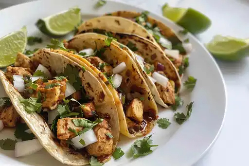 Taco de pechuga de pollo con tortilla de maíz, cebolla, cilantro y limón.
