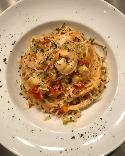 Pasta de sémola preparada con arrachera de res, pollo y camarón, cubierta de chipotle.