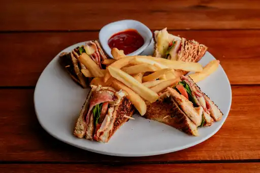 Sándwich elaborado con pechuga de pollo, jamón, queso manchego y queso americano, lechuga, jitomate, pepino y germinado, acompañado con papas a la francesa.