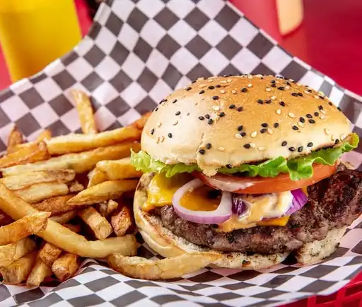 Hamburguesa preparada con carne sirloin de res, lechuga, jitomate, cebolla, mayonesa, y catsup, acompañada con papas a la francesa.
