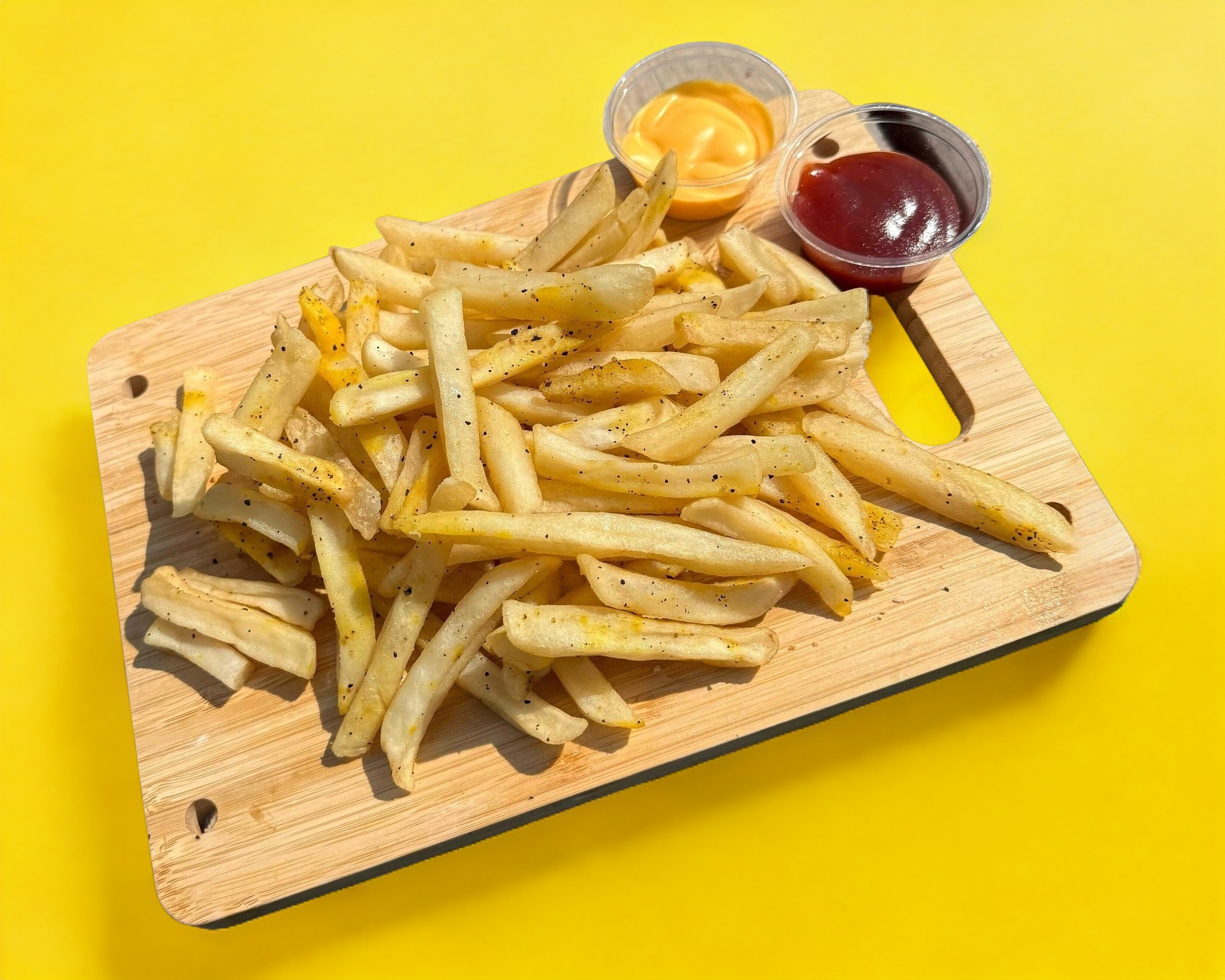 300gr de papas a la francesa con Catsup y Valentina, no incluye queso amarillo
