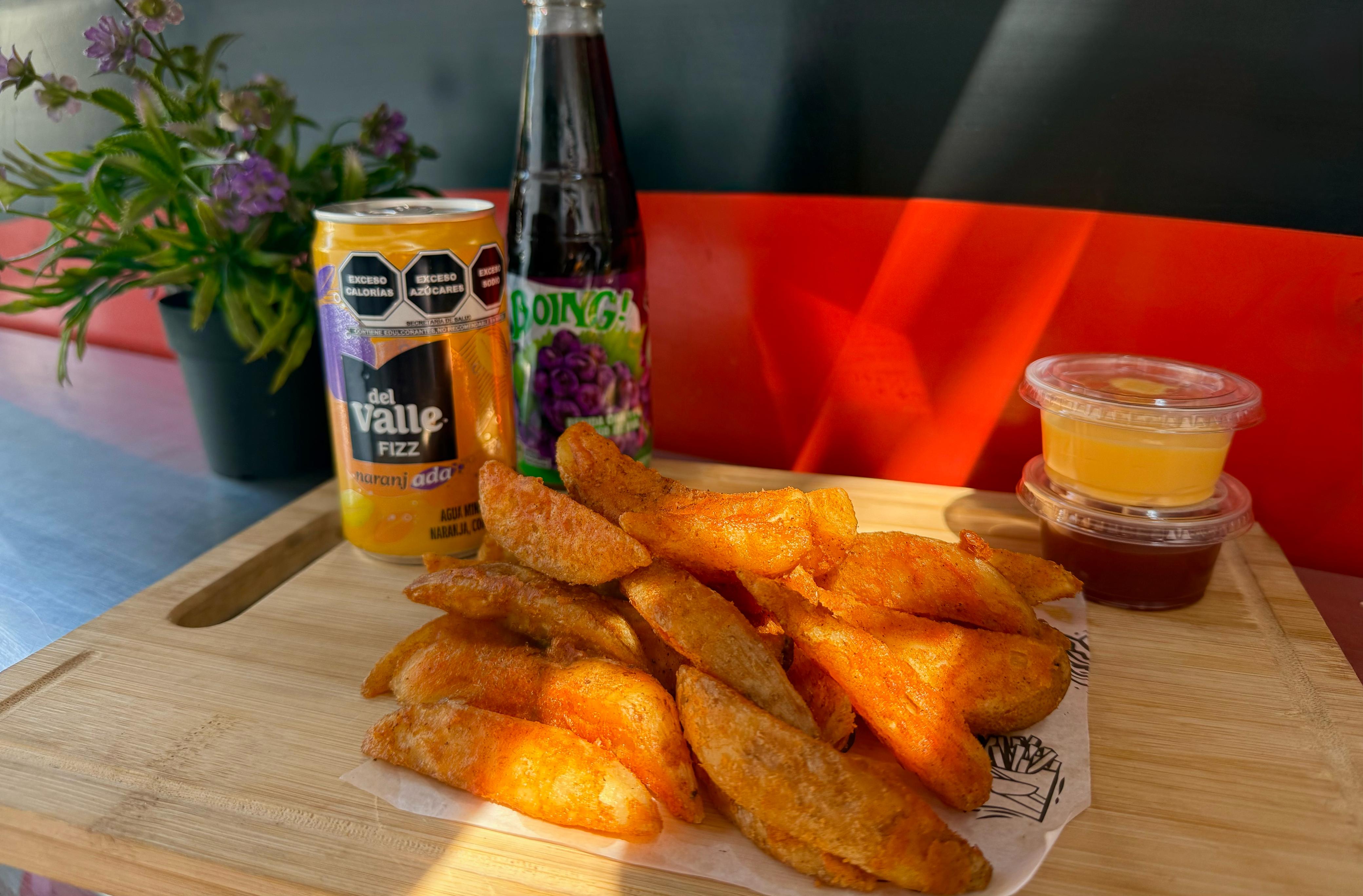 Papas Estilo Waffle con Catsup y Valentina, no incluye Queso amarillo