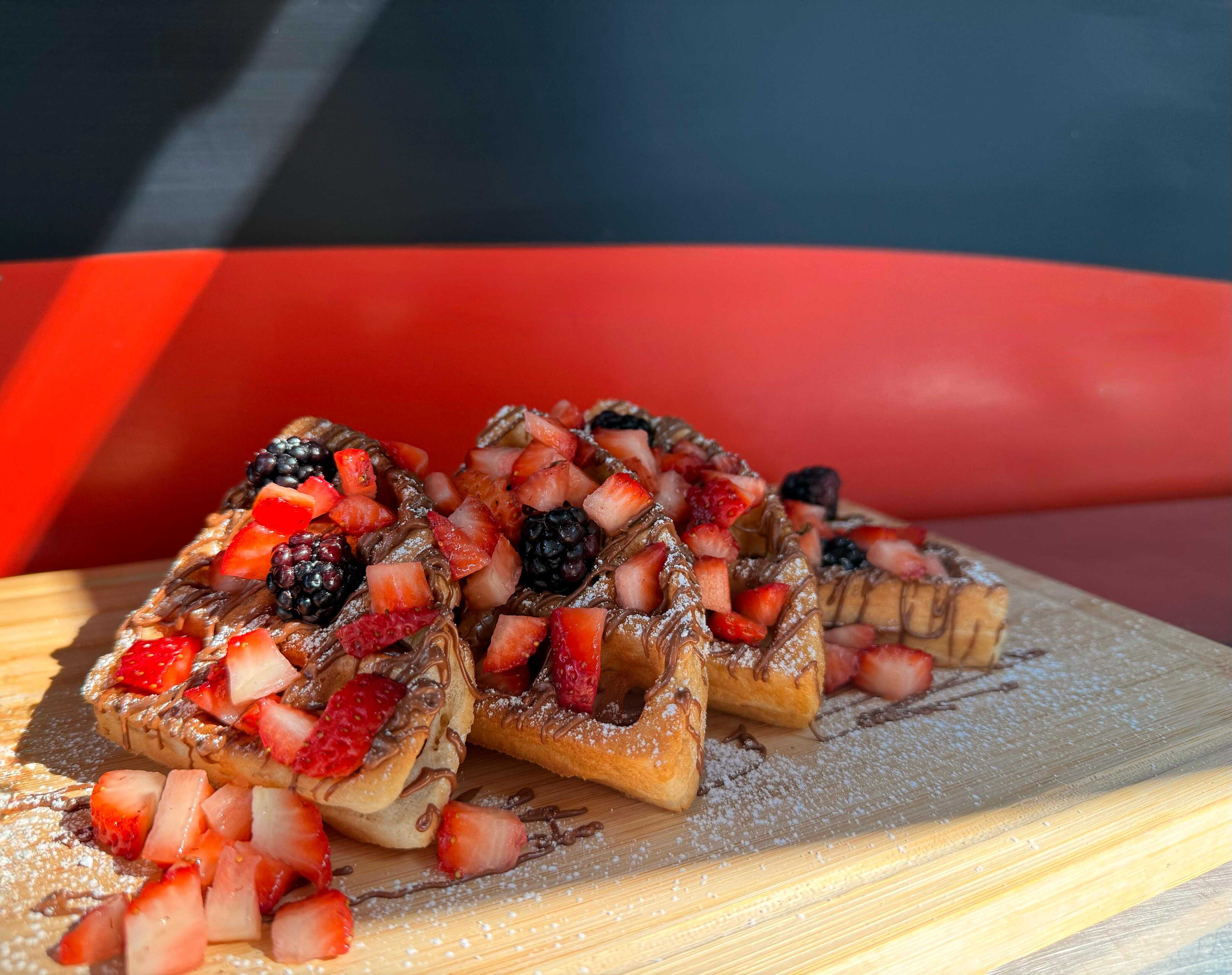 Delicioso waffle dorado por fuera y suave por dentro, servido con mantequilla derretida. Acompañado de frutas frescas de temporada como fresas, plátano, para un toque refrescante. Ideal para los amantes de lo dulce, con la opción de agregar crema batida, chocolate derretido para un extra de sabor.