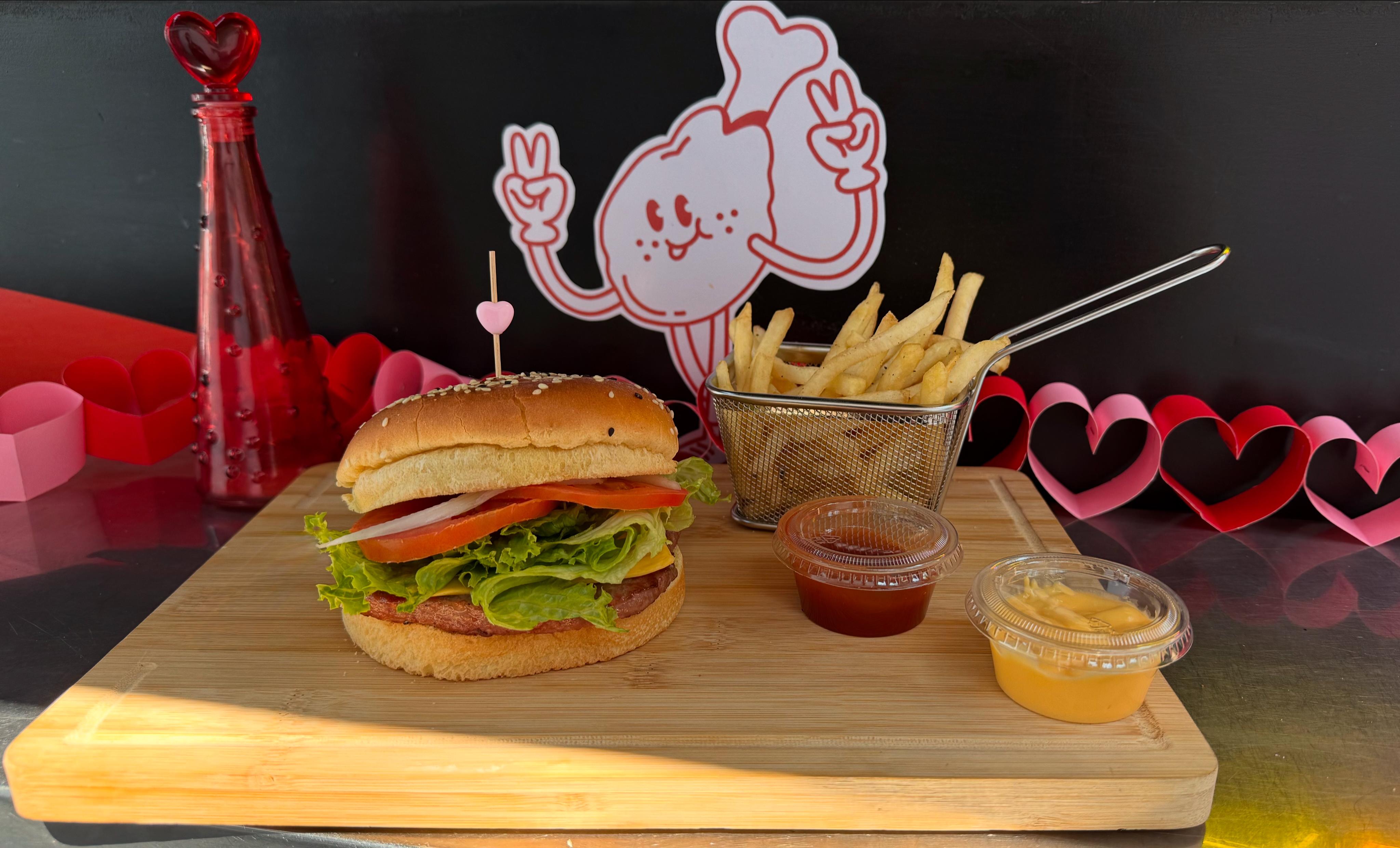 Deliciosa hamburguesa doble carne de res y cerdo moldeada con 120g de papas a la francesa.