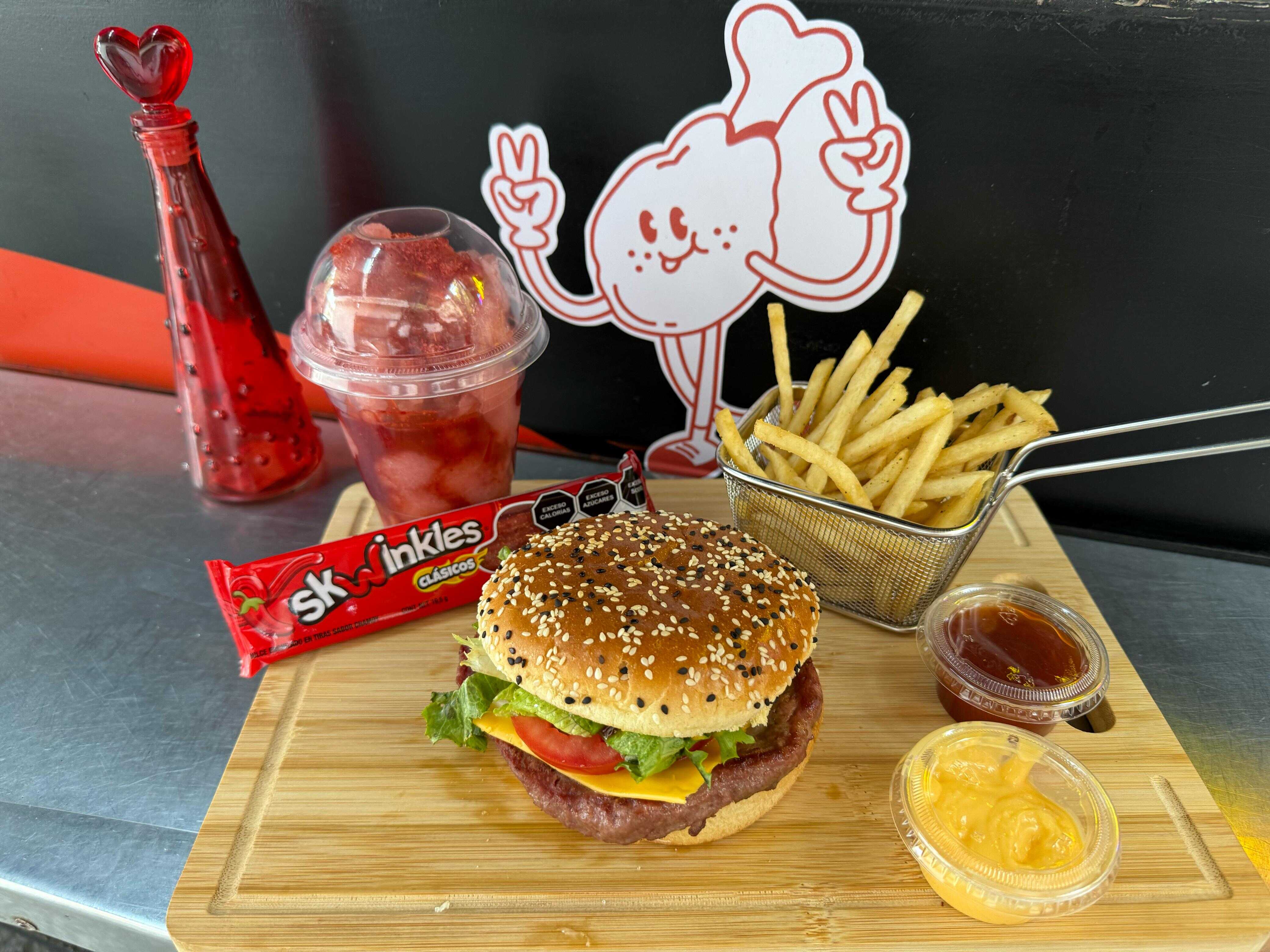 Deliciosa hamburguesa carne de res y cerdo moldeada con 120gr de papas a la francesa.