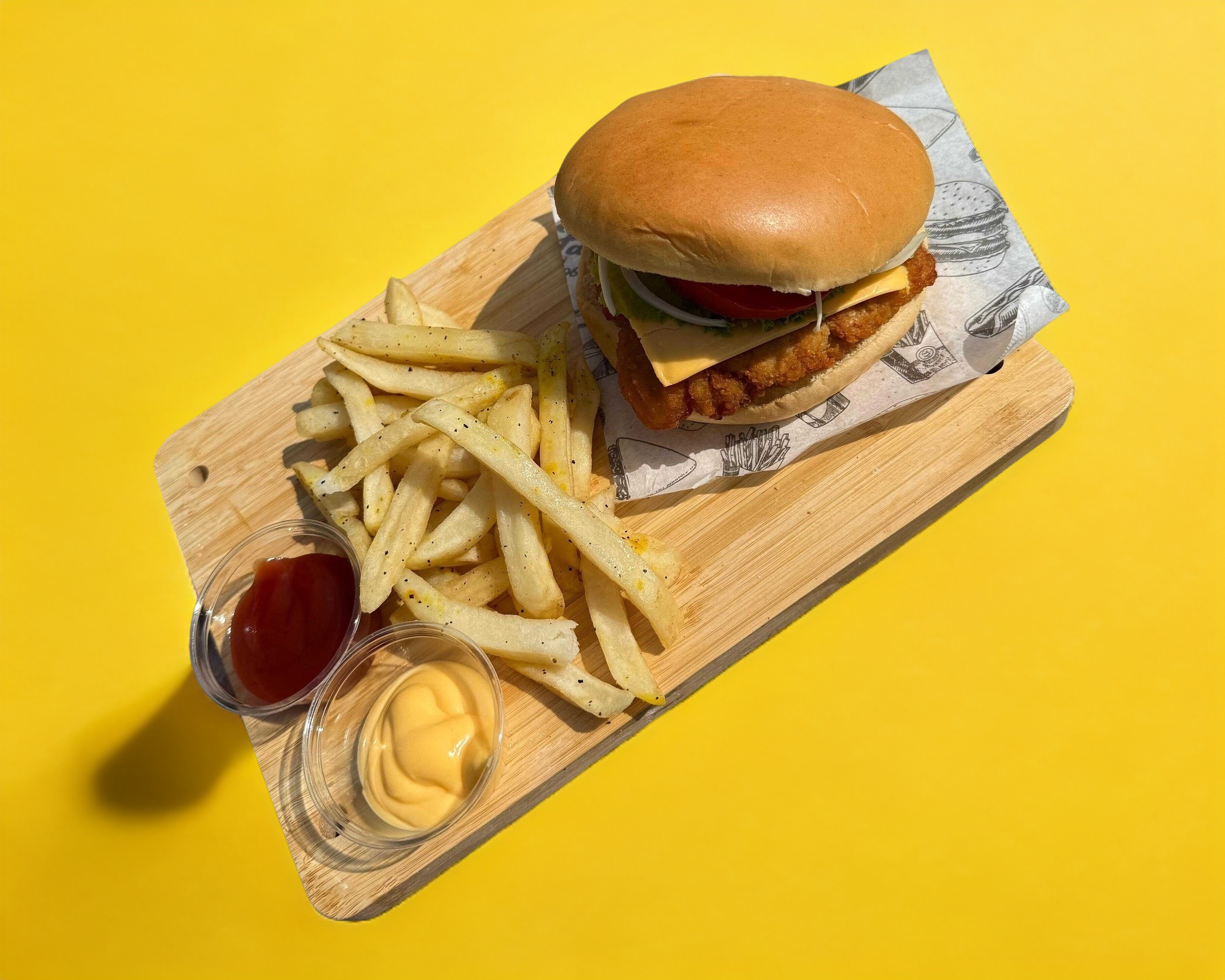 Deliciosa hamburguesa 100% de pollo con 120gr de papas a la francesa.