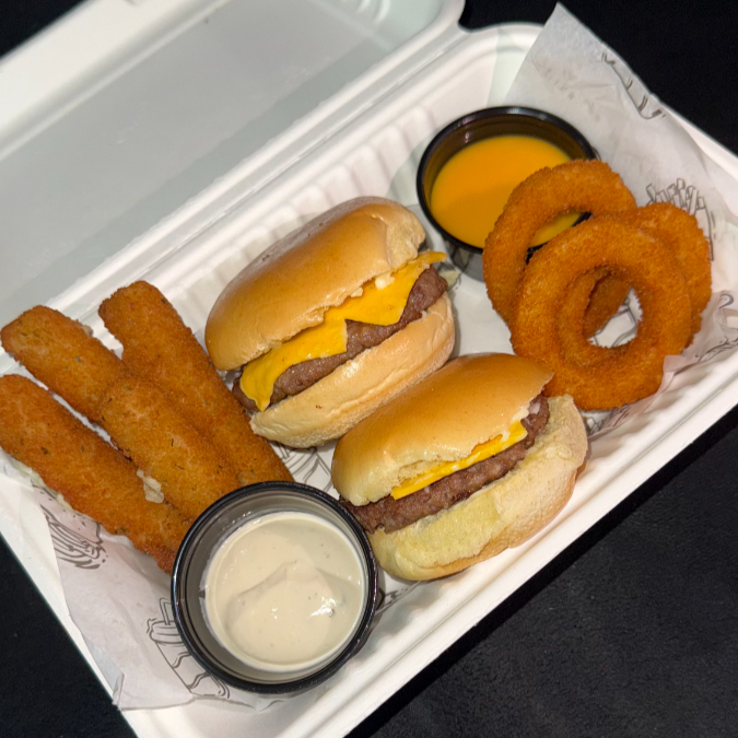 2 Mini Hamburguesas +3 Dedos de Queso + 3 Aros de Cebolla