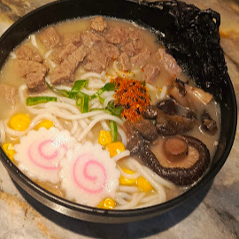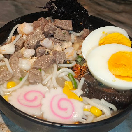 Pasta ramen a base pork, acompañada de hongo shitake, champiñon, naruto, cebollin, elote, alga nori, pollo, res y camarón