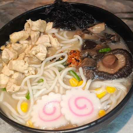Pasta ramen a base pork, acompañada de hongo shitake, champiñon, naruto, cebollin, elote, alga nori y pollo