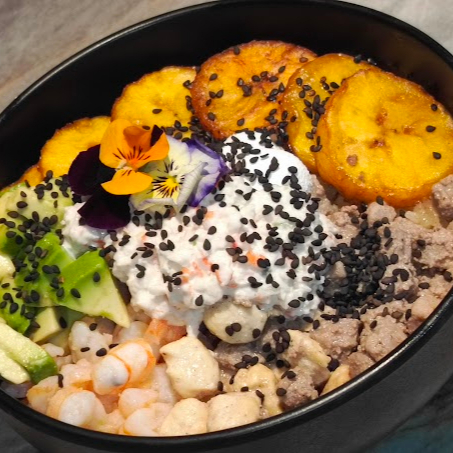 PD: CAMARÓN EMPANIZADO, AGUACATE, QUESO CREMA PF: PLATANO FRITO SALSA CHIPOTLE