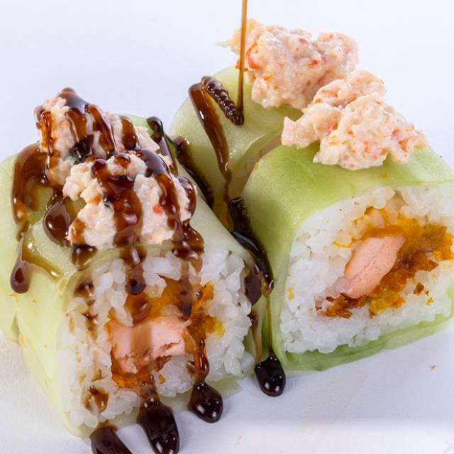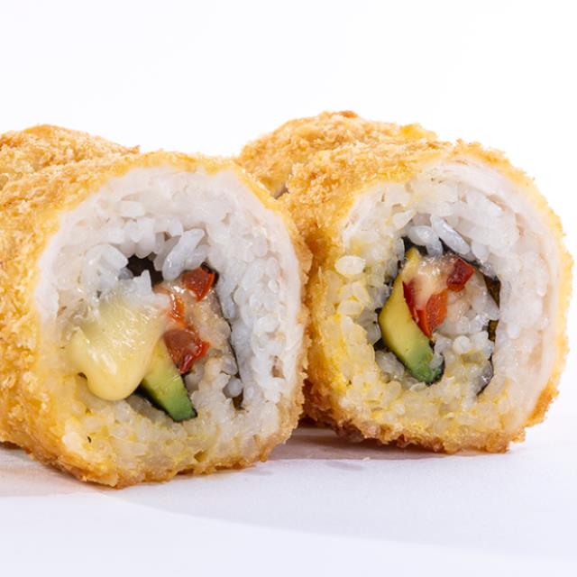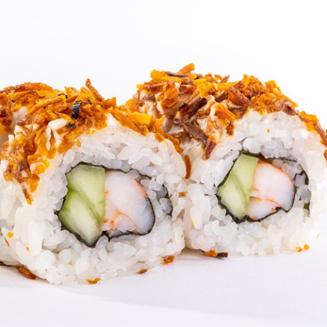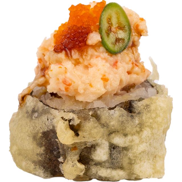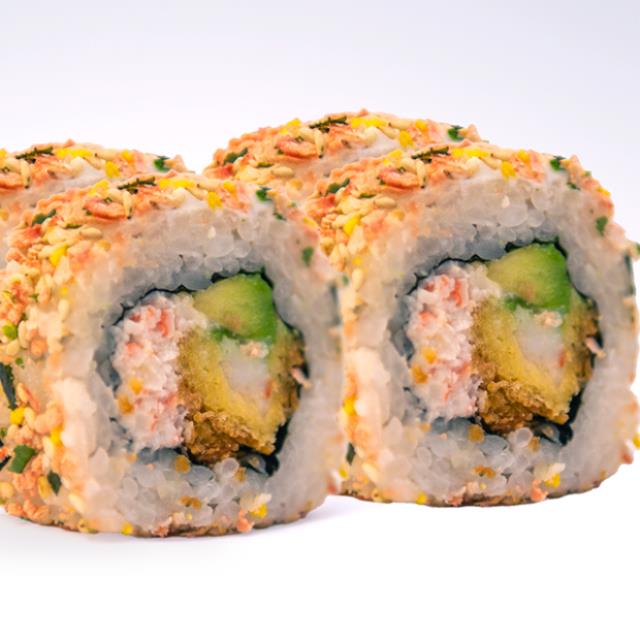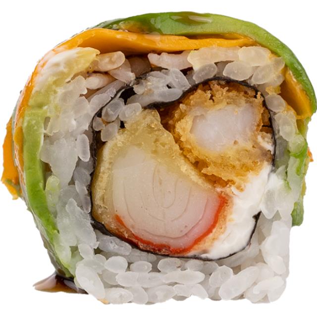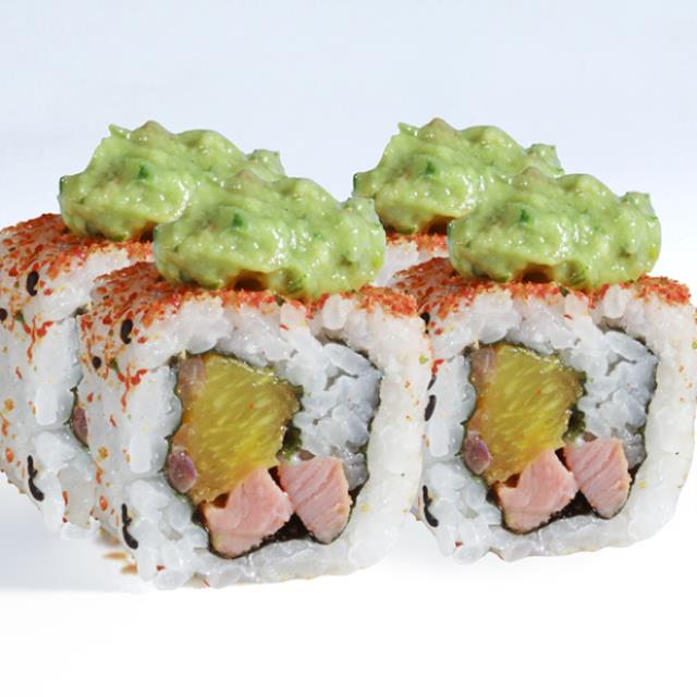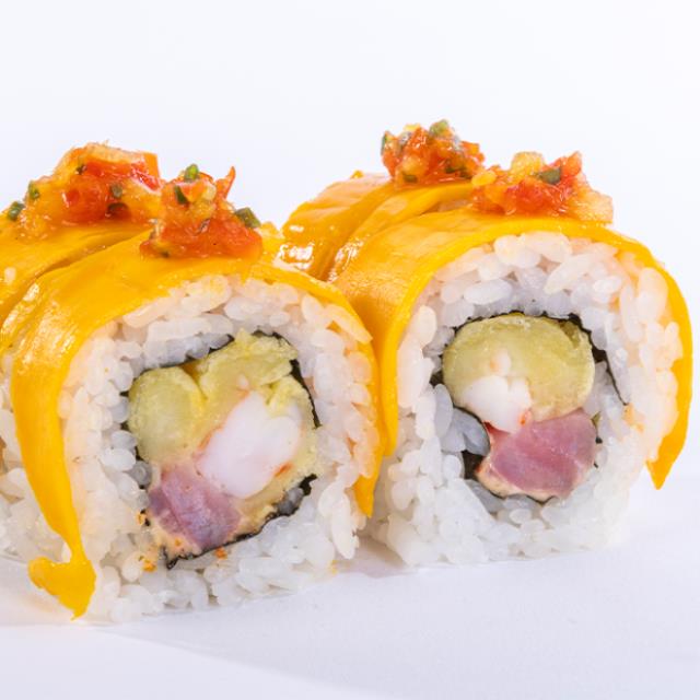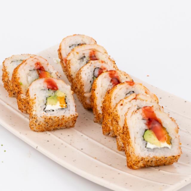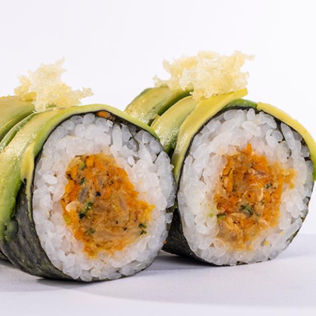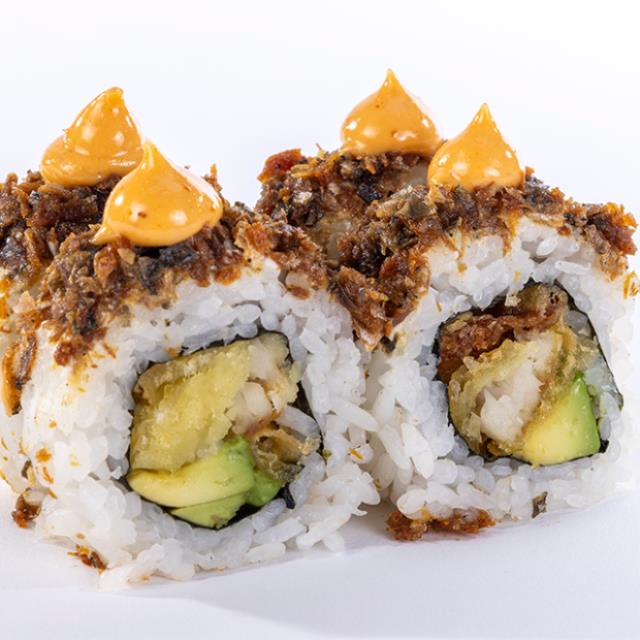 Aguacate, tilapia, tempura con siracha, queso crema, piel de salmón dorada y mayonesa chipotle spicy.