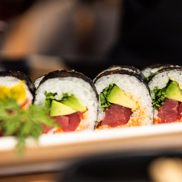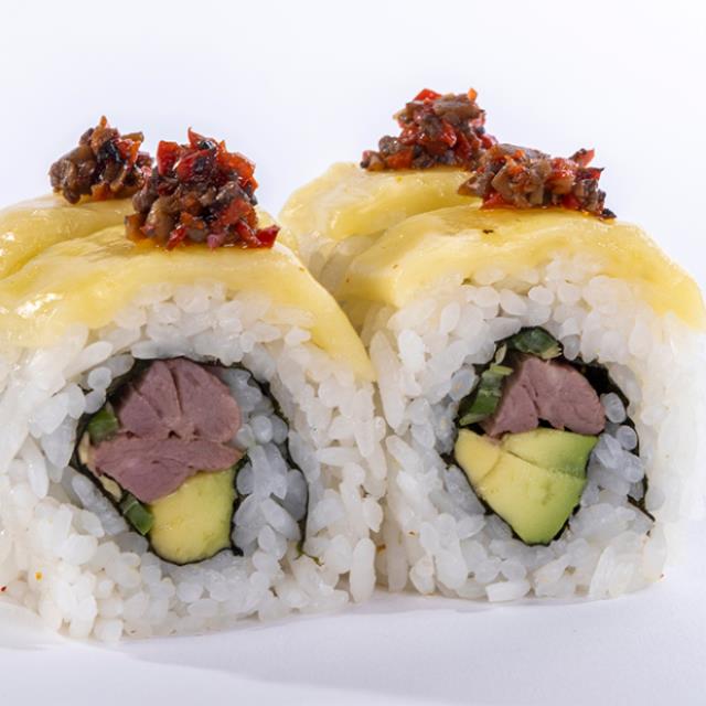Arroz, atún (50g), masago (hueva de pescado), takuan, alga nori, aguacate,ajonjolí, con salsa de anguila y mayonesa chipotle.