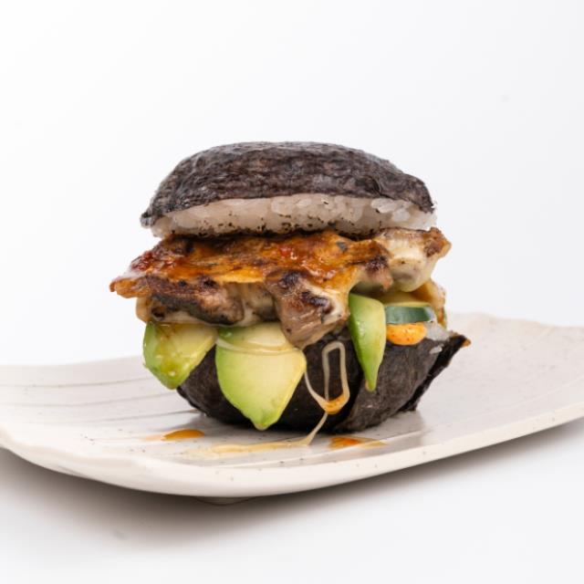 Hamburguesa de arroz estilo Yumi Yumi, rellena de arrachera (50g) con queso, pepino, aguacate, mayonesa Yumi y salsa spicy.
