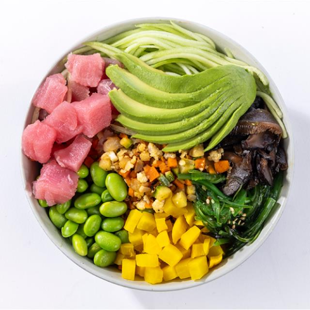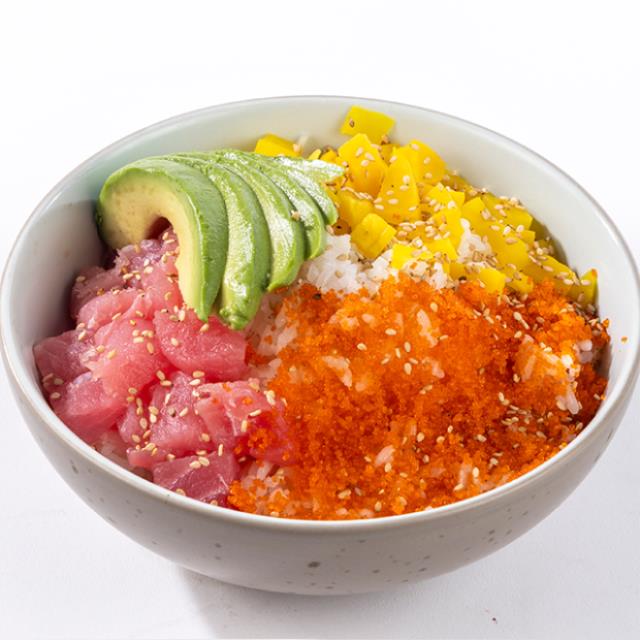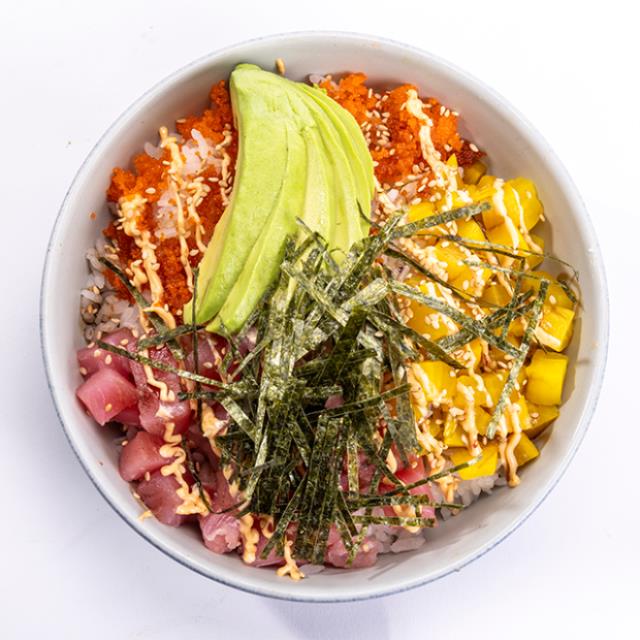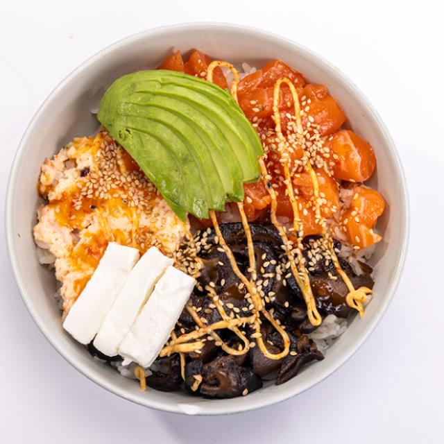 Arroz, salmón (50g), mango,edamame, piel de salmón, pepino, habanero y poke sauce.