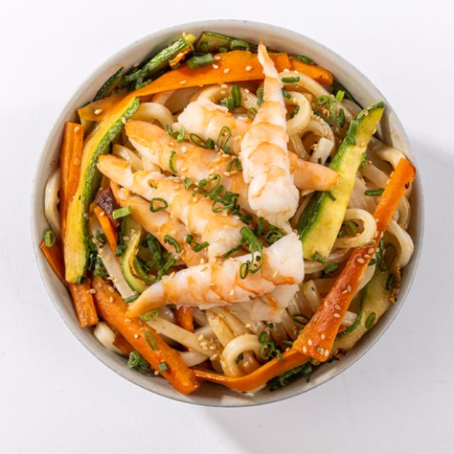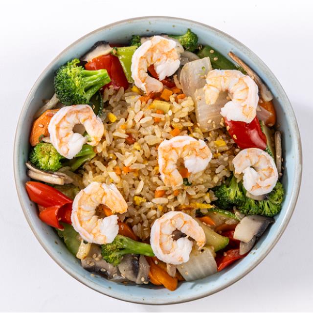 Yakimeshi, calabaza, zanahoria, champiñón, brócoli, cebolla, morrón y camarón (400gr aprox.)