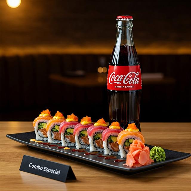 Eleva tu experiencia con un rollo especial, preparado con ingredientes premium, acompañado de un refresco de lata de 355ml para equilibrar los sabores