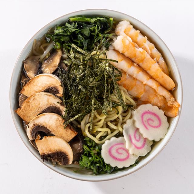 Fondo cristalino a base de camarón acompañado de pasta ramen, cebollín, naruto, espinaca, champiñón, alga nori, yuzu, un toque picosito y la proteína