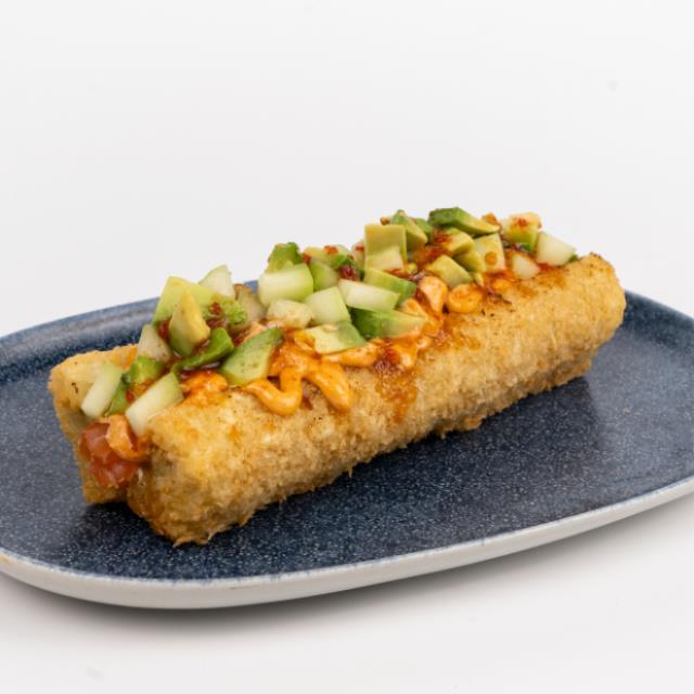 Rollo empanizado estilo Hot Dog, relleno de queso philadelphia, salmón (50g), pepino, aguacate, mayonesa chipotle y salsa spicy.