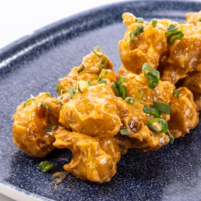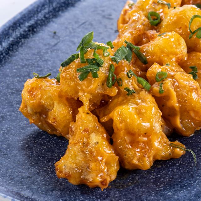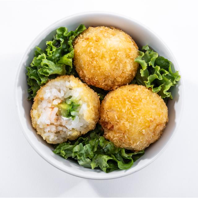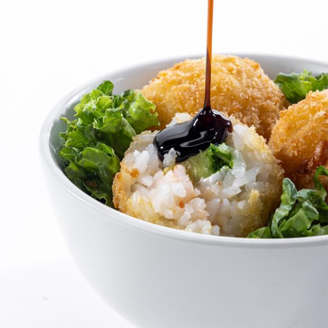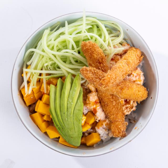 Arroz, camarón empanizado (2pzs.), mango, tampico, pepino, aguacate, salsa spicy y poke sauce.