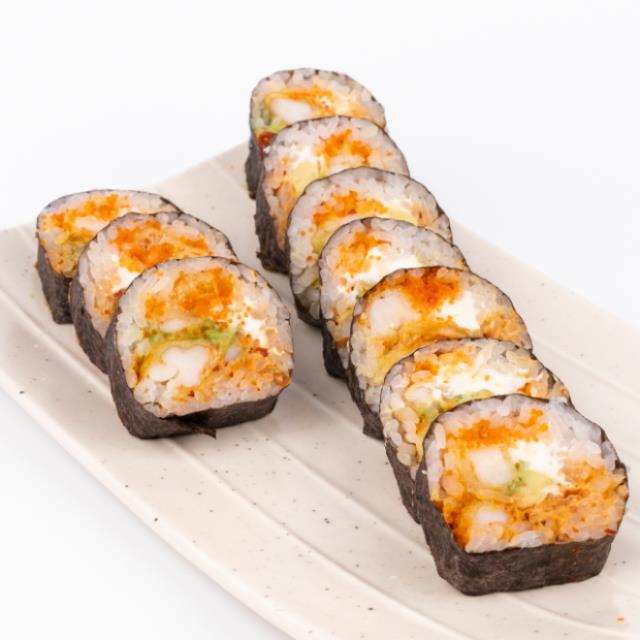 Camarón tempura (1pza), surimi (20g), pasta dinamita, aguacate y queso philadelphia. XF: Nori.