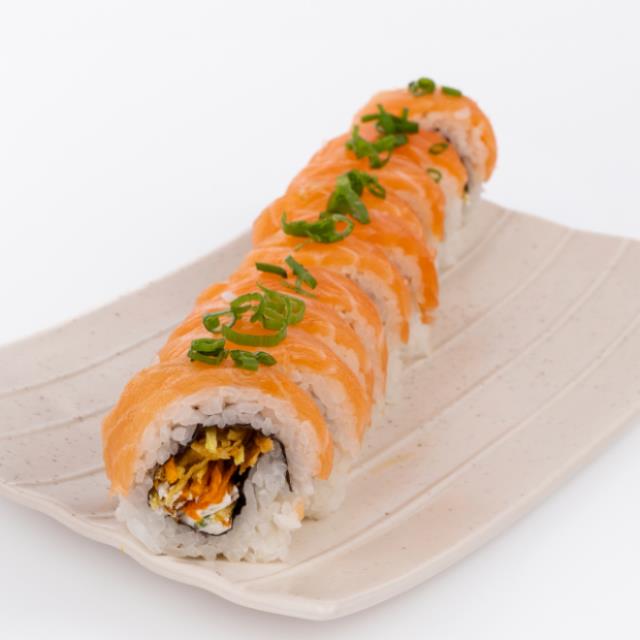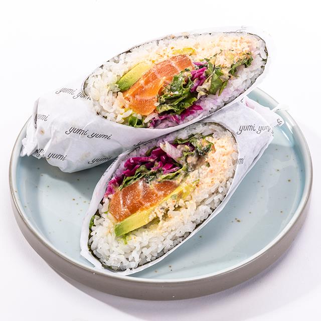 Arroz, salmón (50g), salsa tampico, shiitake (hongo japonés), queso philadelphia, aguacate, ajonjolí, con salsa spicy Yumi Yumi.