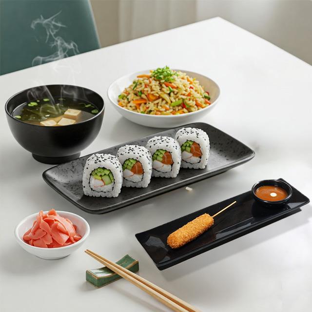 Sopa Miso (180 ml), kusiague de queso, yakimeshi de verduras chico (150 g) y ½ California Roll.