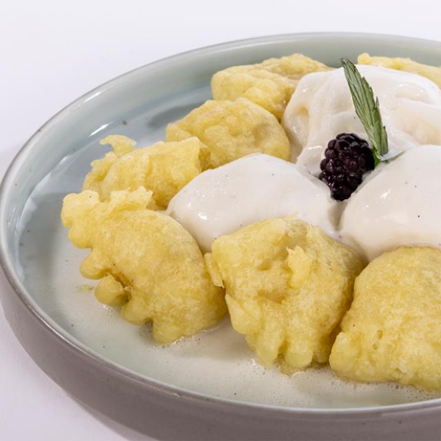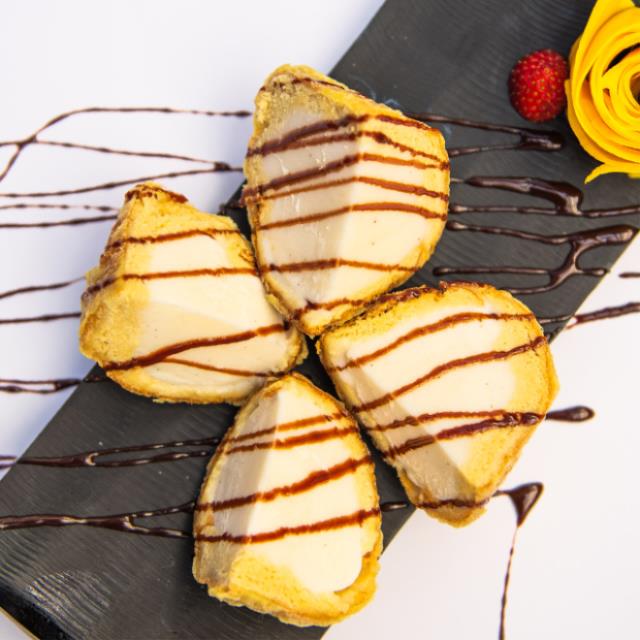 Helado de vainilla envuelto en pan brioche, cubierto de pasta tempura y salsa de chocolate, fresa o cajeta a elegir.