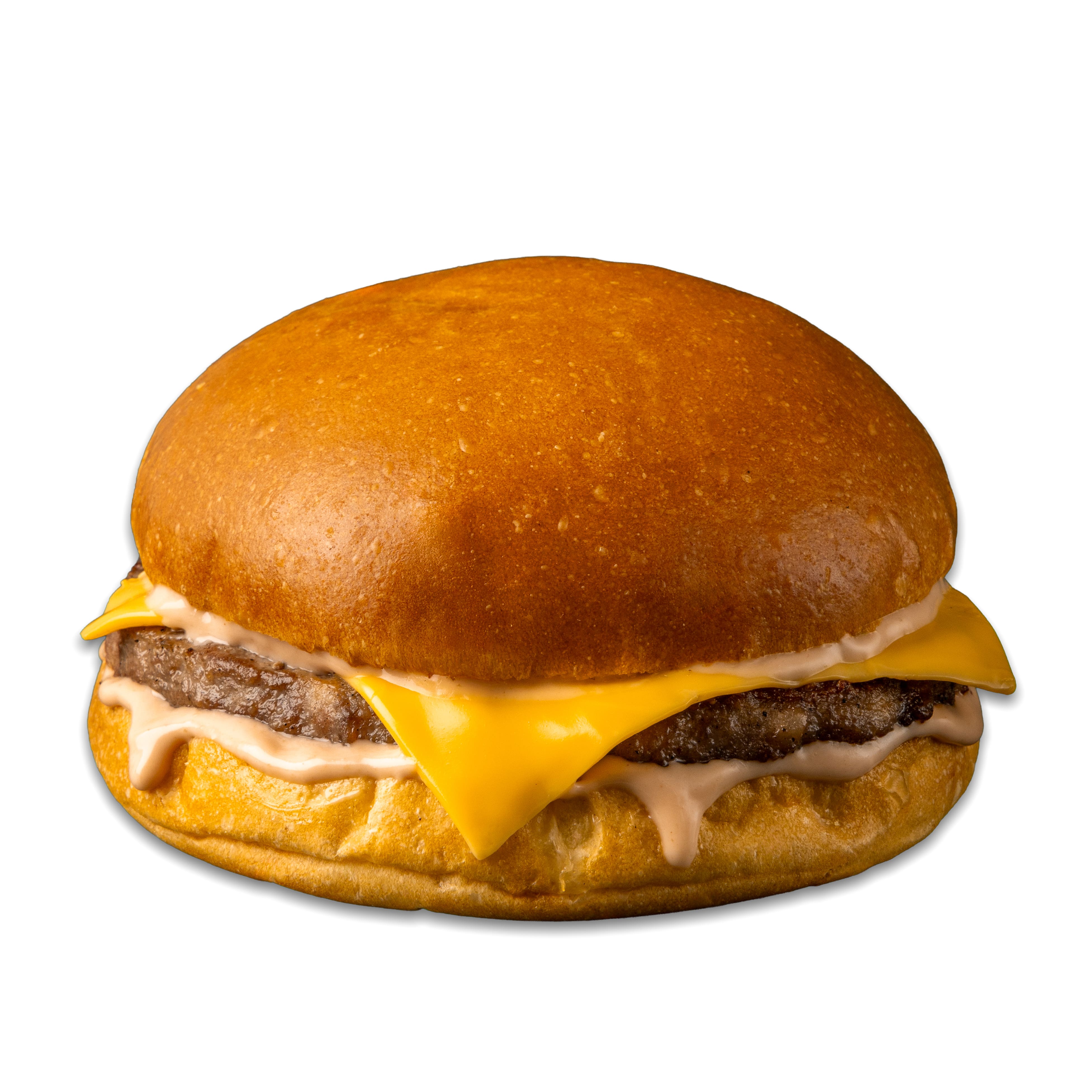 Hamburguesa con queso: Pan Brioche con un toque de mantequilla, Carne de res de 115 g (peso en crudo), aderezo clasico y queso americano.