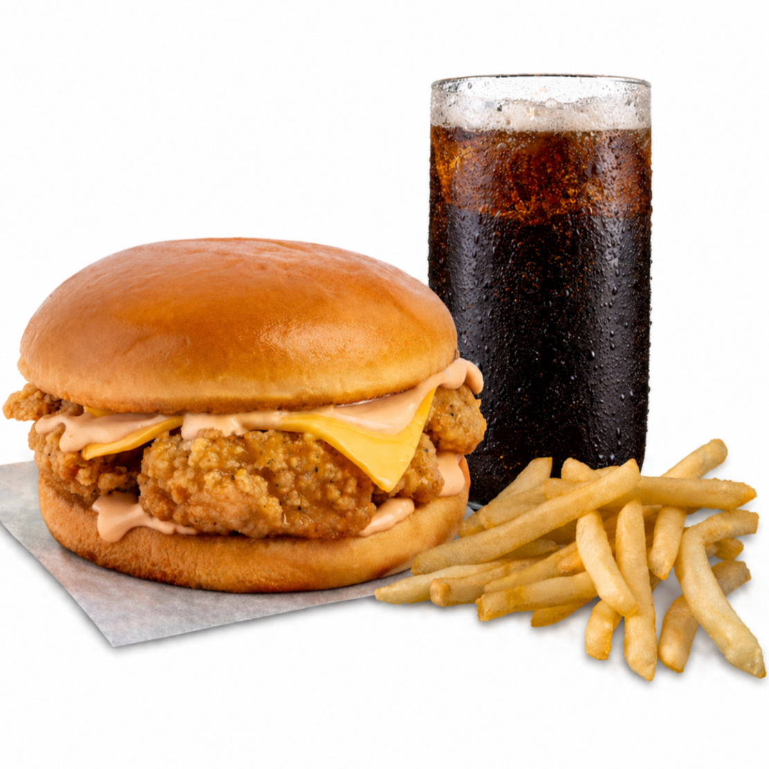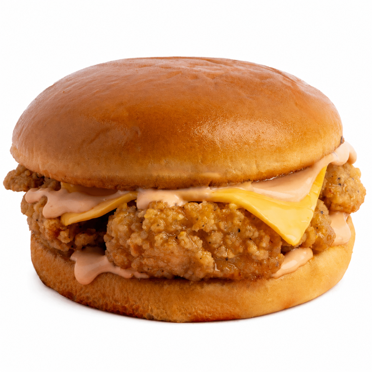 Hamburguesa de Pollo: Pan Brioche con un toque de mantequilla, Boneless de Pechuga de pollo natural, sazonada y bañada en salsa de tu preferencia, aderezo clásico y queso americano.