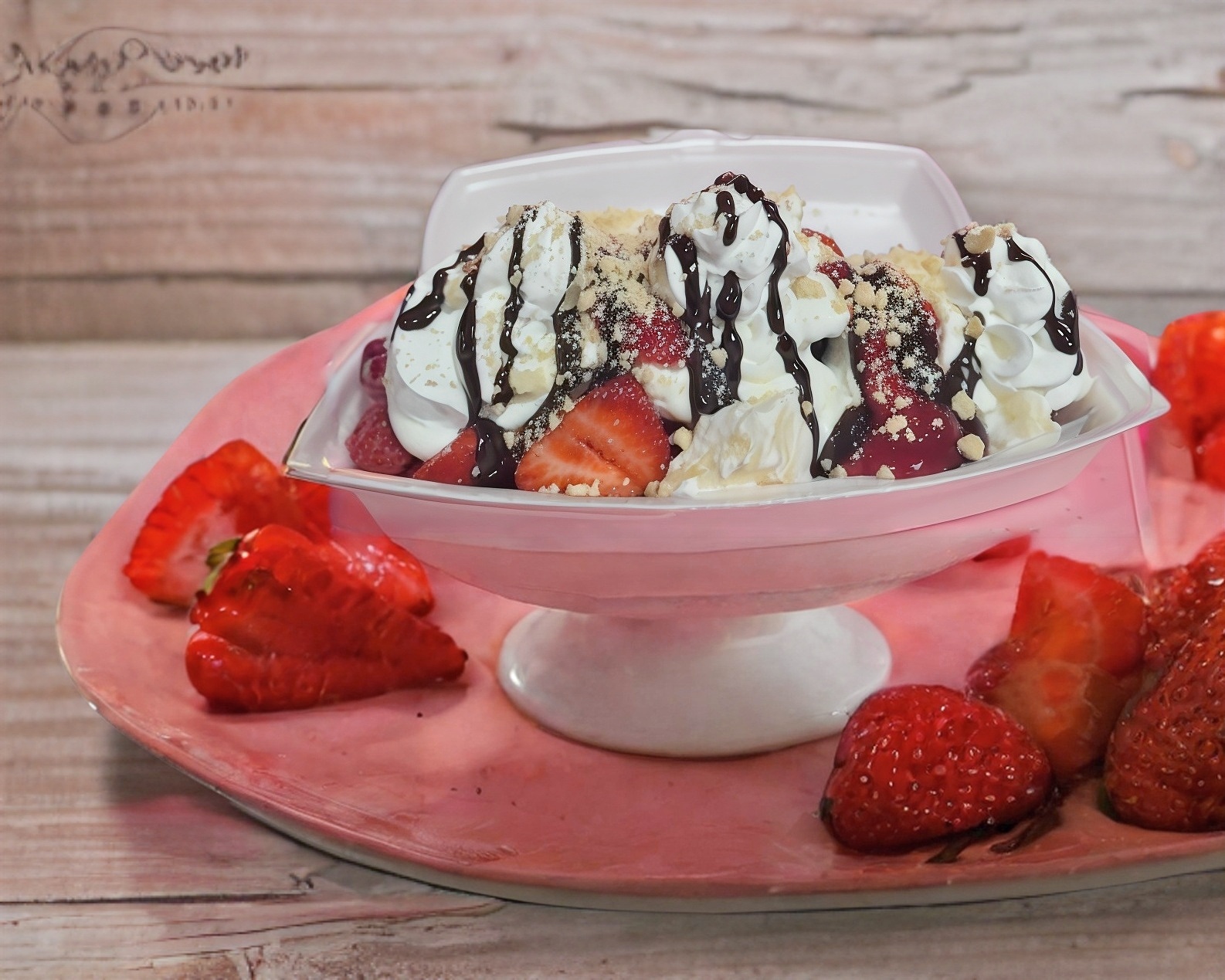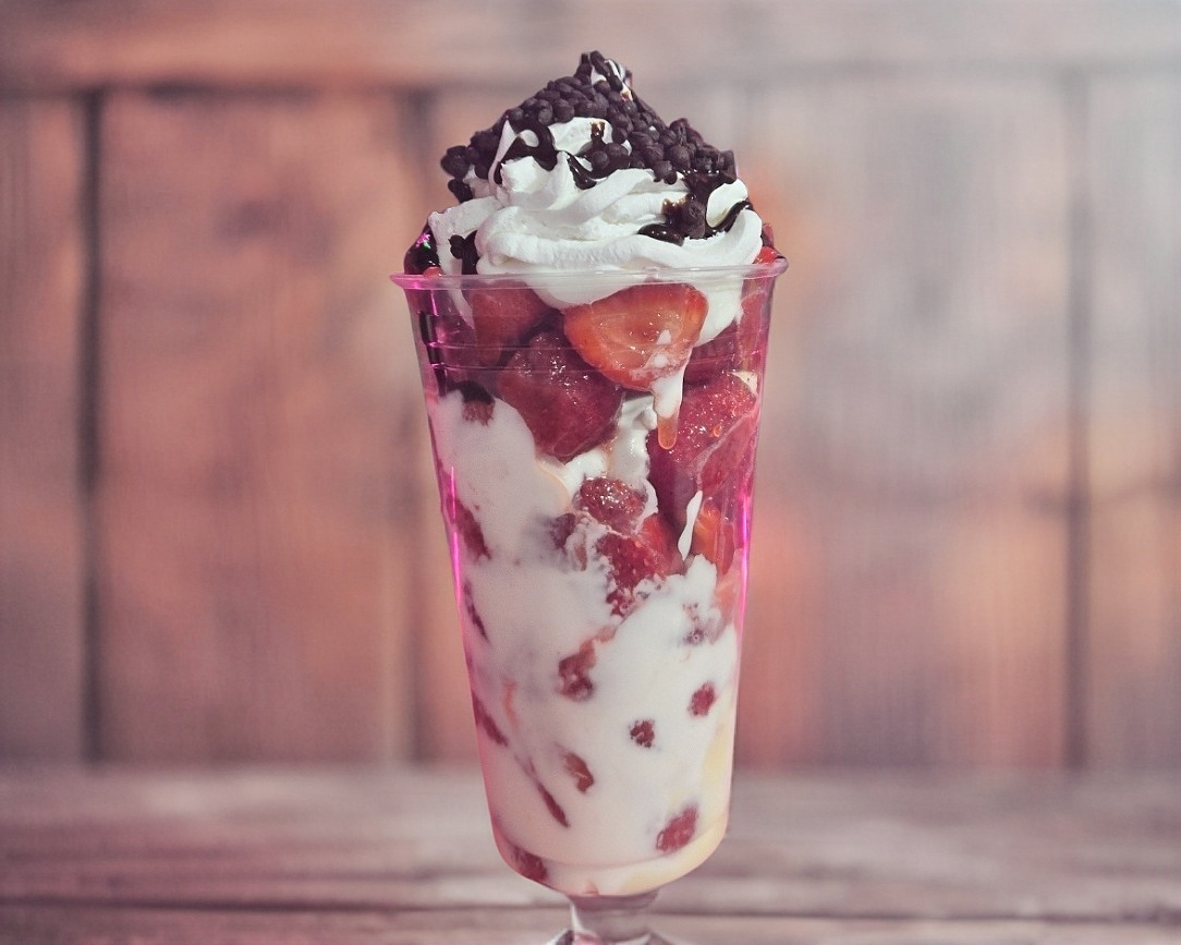 vaso de 14 onzas de fresas, con crema de la casa, chantilly lechera y dos toppings