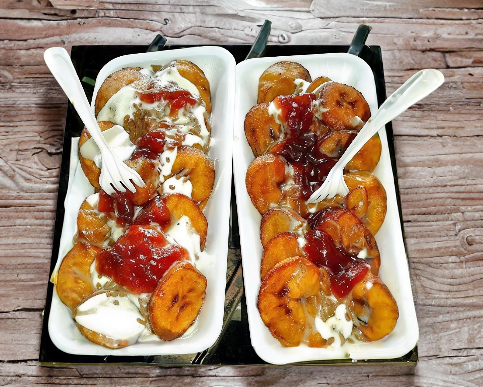 platanos fritos cubiertos de postres fresas manzanas uvas mas chantilly crema lechera