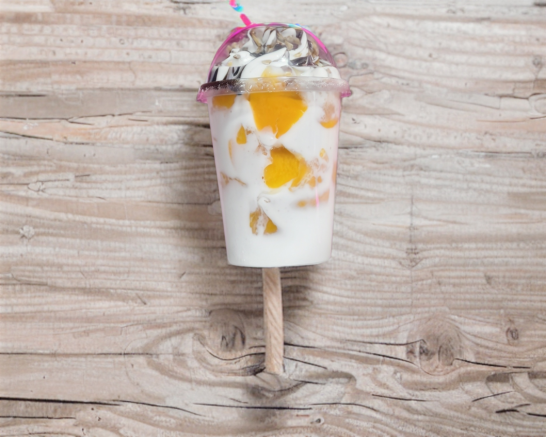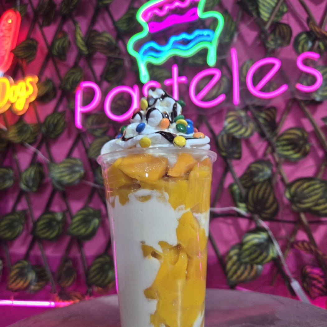 VASO DE MEDIO LITRO CON MANGOS Y CREMA DE LA CASA CON CHANTILLY LECHERA HERSHYE Y DOS TOPPINGS