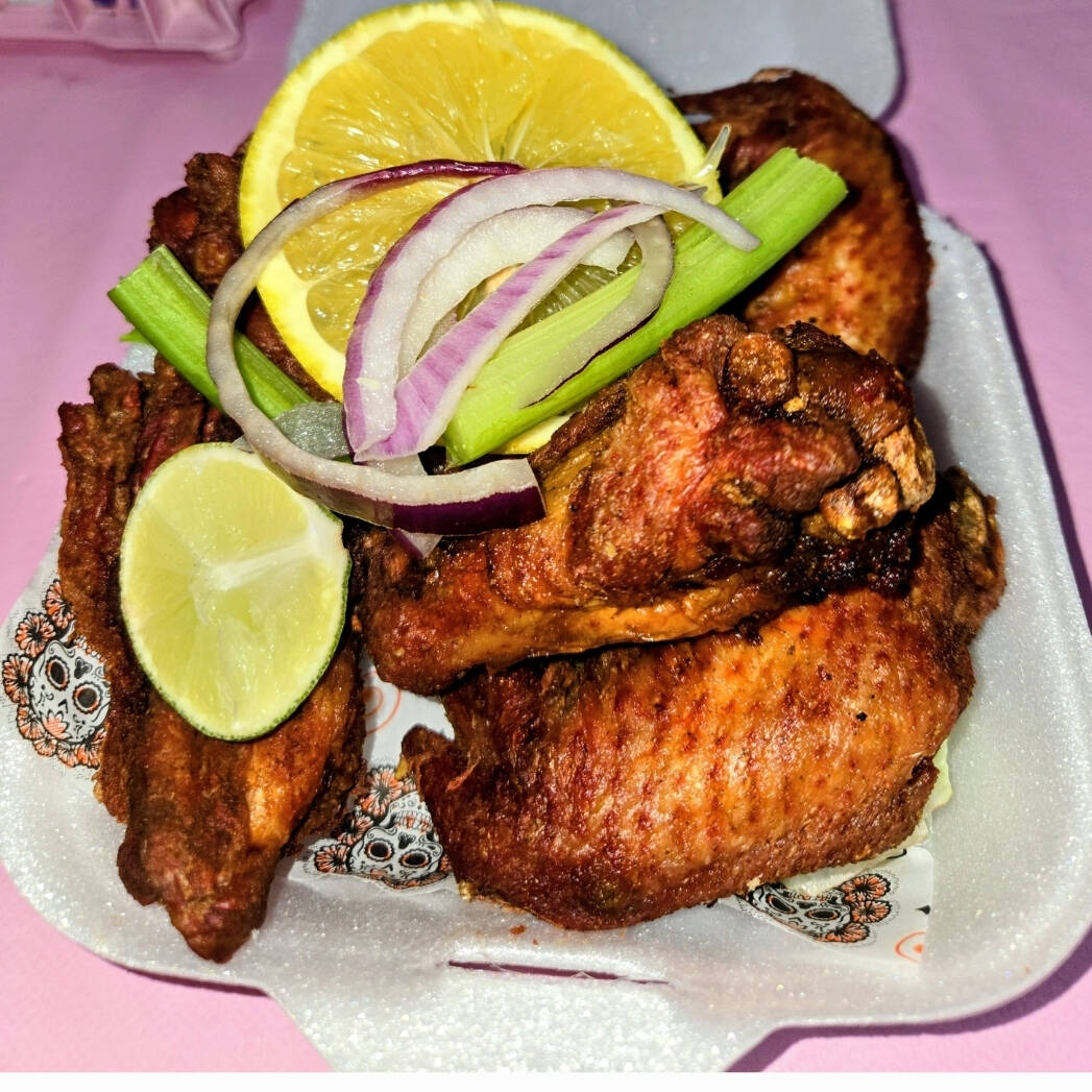 6 piezas de deliciosas alitas marinadas [receta secreta] acompañada de apio limon naranja y cebolla morada
