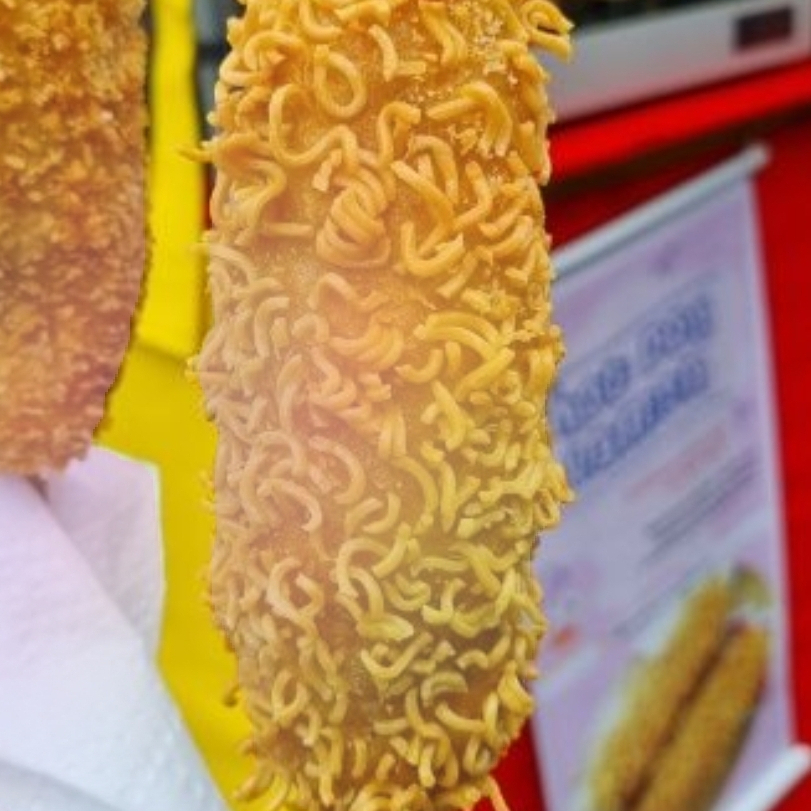 banderilla coreana base mixta salchicha y queso mozarella cobertura de ramen con 5 derezos